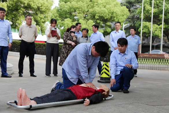 疏散結(jié)束后,開展人員應急急救演練,模擬對傷員進行心肺復蘇搶救。