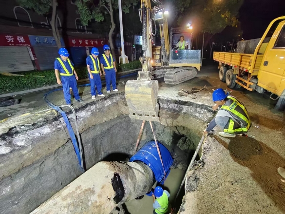 7月1日清晨5時許,蚌埠中環(huán)管線所應(yīng)急值班人員接到群眾來電,勝利東路與興業(yè)街交叉口供水管道突發(fā)漏水。接到管道漏水指令后,管線所立即組織搶修人員第一時間趕赴現(xiàn)場,全力投入搶修工作。 公司黨委書記、董事長錢然,黨委副書記、總經(jīng)理徐波,副總經(jīng)理張自強(qiáng)前往現(xiàn)場指導(dǎo)搶修工作。經(jīng)排查,爆裂管道為運(yùn)行近30年的DN900mm復(fù)合型鋼管,因年久導(dǎo)致管身出現(xiàn)多處銹蝕漏洞。 搶修現(xiàn)場車流量大,給搶修定點(diǎn)帶來困難。工作人員協(xié)調(diào)交警緊急封閉勝利路(興業(yè)街—航華路)由東向西主干道,并協(xié)助指揮交通,為搶修施工創(chuàng)造條件。搶修人員精確判定漏水點(diǎn)并關(guān)閉閥門后迅速組織挖掘施工,由于該處漏水管道為鋼制登高管件,修復(fù)難度較大,搶修人員通過安裝搶修哈夫節(jié)、焊接修補(bǔ)等方式,最終完成修復(fù)。 期間,黑虎山水廠根據(jù)停水管段影響范圍,及時調(diào)整管網(wǎng)壓力,客服中心同步解答降壓區(qū)域用戶咨詢。經(jīng)過一天一夜緊張有序的搶修施工,該處漏水管道已妥善修復(fù),供水系統(tǒng)恢復(fù)正常運(yùn)行。