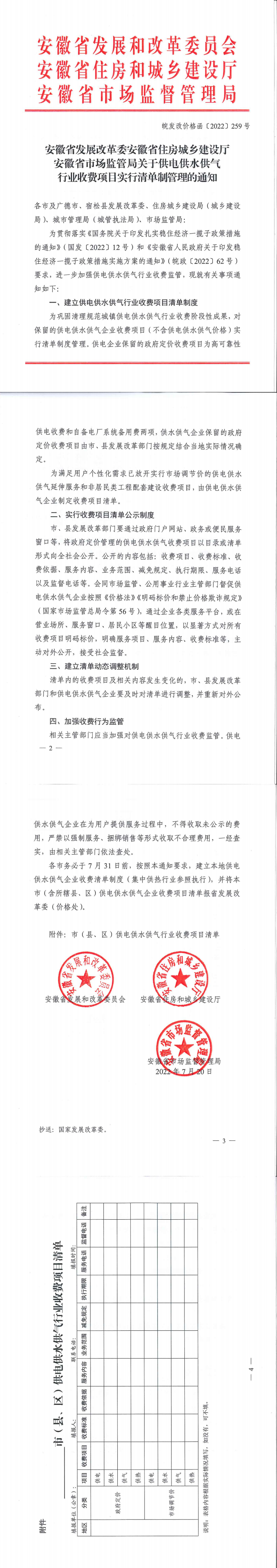 《安徽省發(fā)展改革委安徽省住房城鄉(xiāng)建設(shè)廳安徽省市場(chǎng)監(jiān)管局關(guān)于供電供水供氣行業(yè)收費(fèi)項(xiàng)目實(shí)行清單制管理的通知》安徽省發(fā)展改革委安徽省住房城鄉(xiāng)建設(shè)廳安徽省市場(chǎng)監(jiān)管局(皖發(fā)改價(jià)格函〔2022〕259號(hào))文件