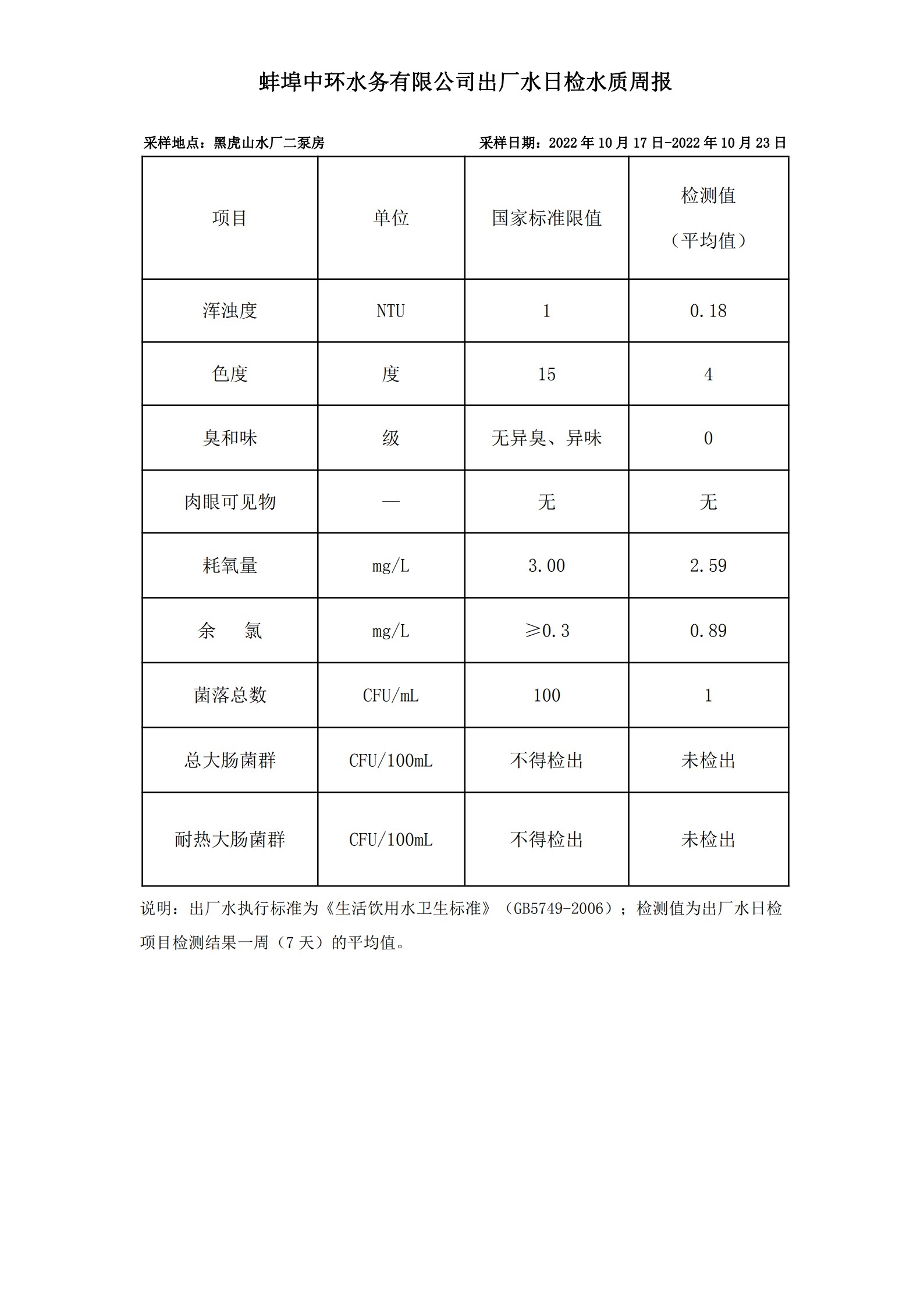 出廠水日檢水質(zhì)周報(bào)(2022年10月17日-2022年10月23日)