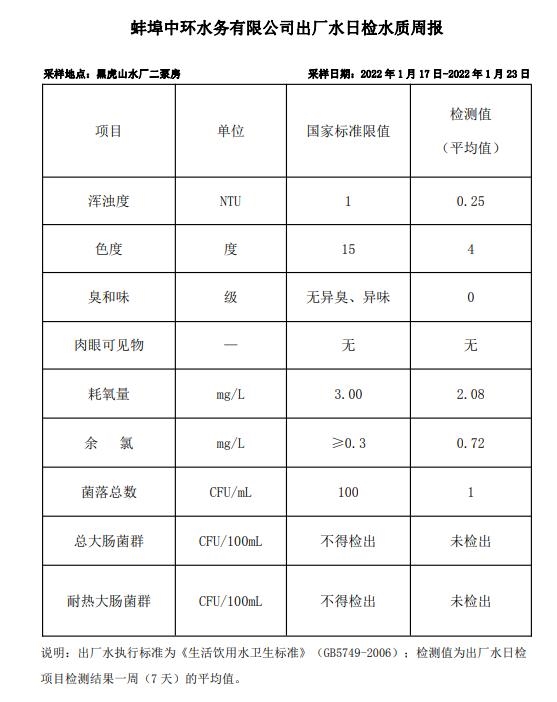 蚌埠中環(huán)水務有限公司出廠水日檢水質周報(2022年1月17日-2022年1月23日)