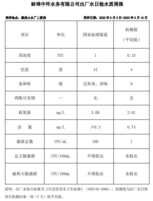 蚌埠中環(huán)水務(wù)有限公司出廠水日檢水質(zhì)周報(bào)(2022年5月9日-2022年5月15日)