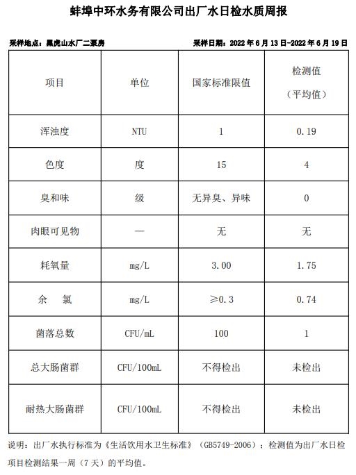 蚌埠中環(huán)水務(wù)有限公司出廠水日檢水質(zhì)周報(bào)(2022年6月13日-2022年6月19日)