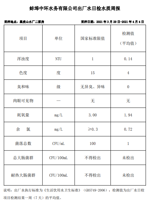 蚌埠中環(huán)水務(wù)有限公司出廠水日檢水質(zhì)周報(2021年3月29日-2021年4月4日)