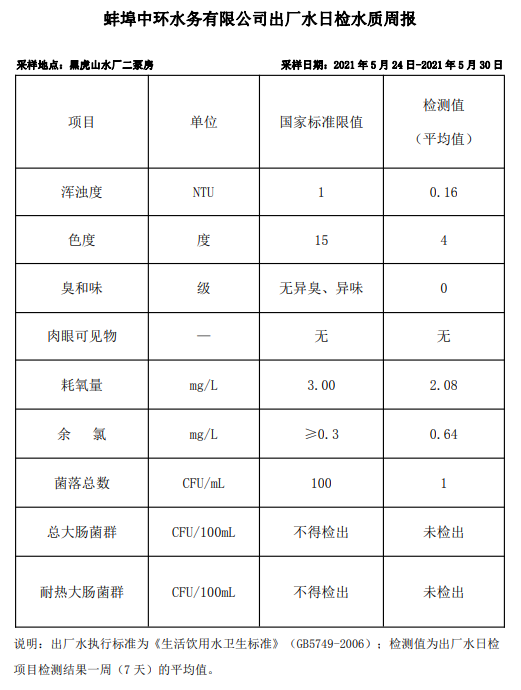 蚌埠中環(huán)水務(wù)有限公司出廠水日檢水質(zhì)周報(2021年5月24日-2021年5月30日)