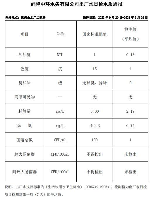 蚌埠中環(huán)水務(wù)有限公司出廠水日檢水質(zhì)周報(bào)(2021年9月20日-2021年9月26日)