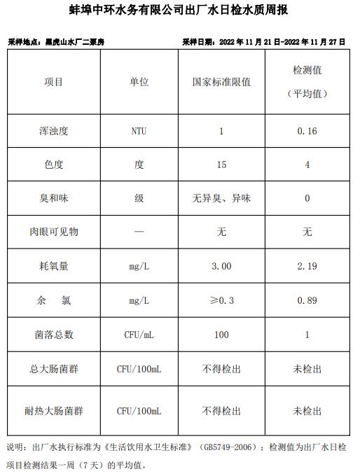 蚌埠中環(huán)水務(wù)有限公司出廠水日檢水質(zhì)周報(bào)(2022年11月21日-2022年11月27日)