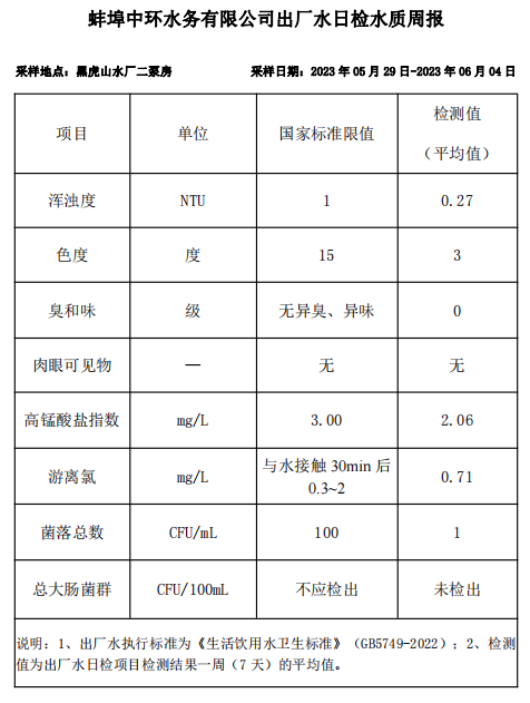 蚌埠中環(huán)水務(wù)有限公司出廠水日檢水質(zhì)周報(bào)(2023年05月29日-2023年06月04日)