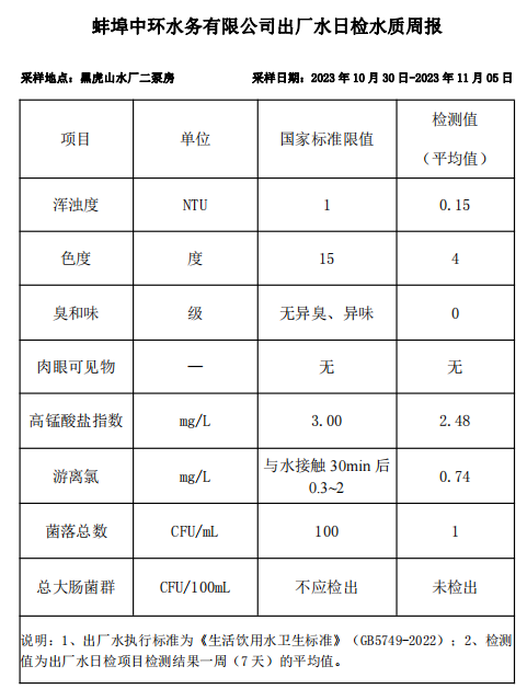 蚌埠中環(huán)水務(wù)有限公司出廠水日檢水質(zhì)周報(bào)(2023年10月30日-2023年11月05日)