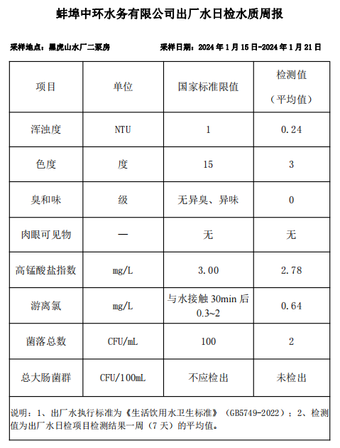 蚌埠中環(huán)水務有限公司出廠水日檢水質周報(2024年1月15日-2024年1月21日)