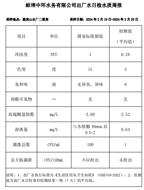 蚌埠中環(huán)水務有限公司出廠水日檢水質周報(2024年2月19日-2024年2月25日)