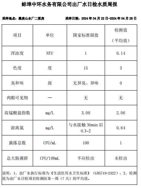 蚌埠中環(huán)水務(wù)有限公司出廠水日檢水質(zhì)周報(bào)(2024年04月22日-2024年04月28日)